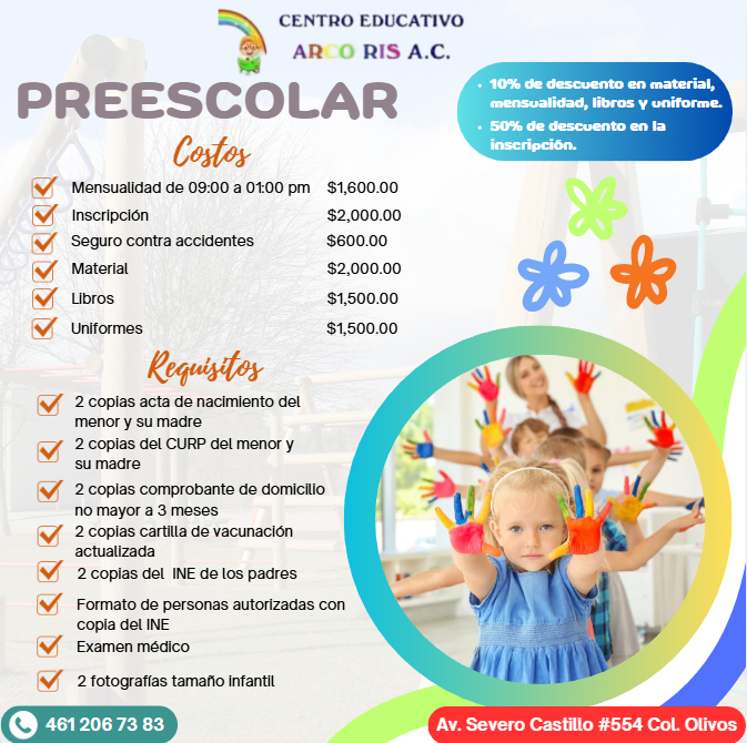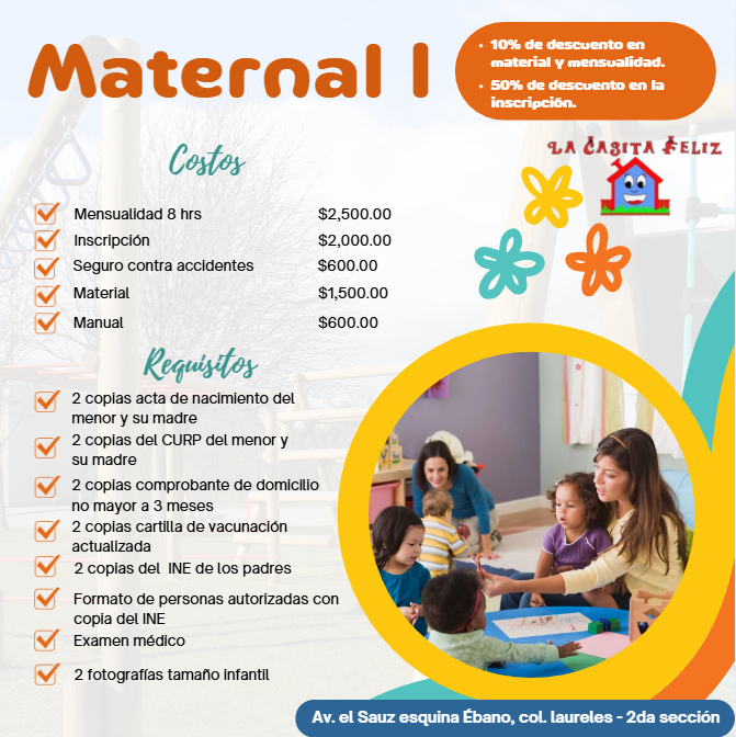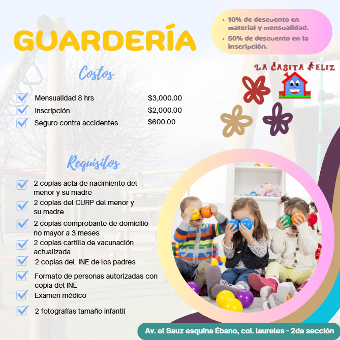 Convenio realizado con Servicios de Guardería y Educativos, contando con 20 lugares disponibles por estancia "Centro educativo arcoiris" y "Estancia infantil la casita feliz", para quien desee pre-inscribirse con el Departamento de Desarrollo Humano y Organizacional o directamente con la directora de las estancias, como siempre en pro de conciliar la vida laboral y familiar de nuestro personal.